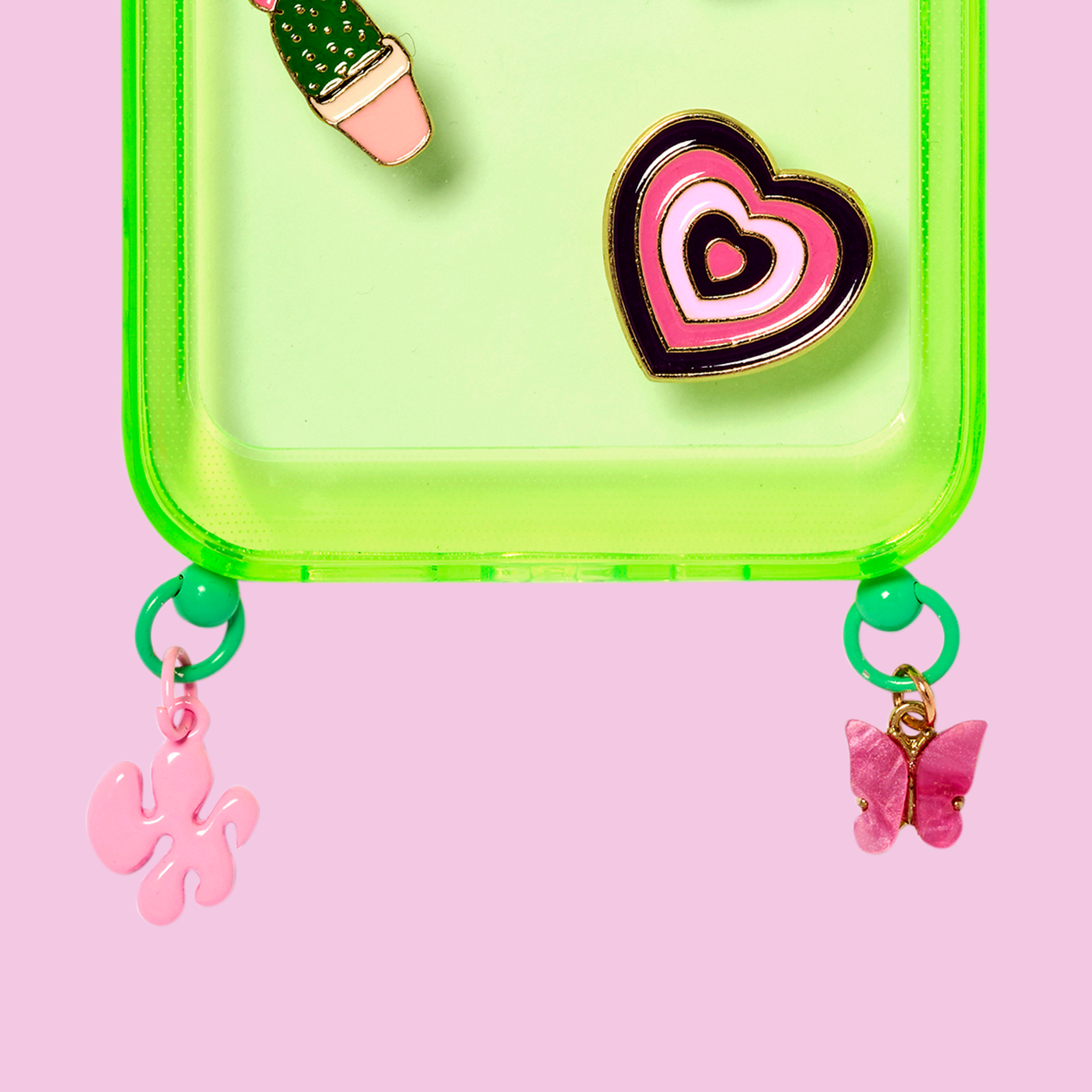 Placera strap holder på insidan av mobilskalet och dra hänget genom öppningen för laddkontakten. När strap holder sitter på plats sätter du i telefonen i skalet och fäster mobilarmbandet på den.